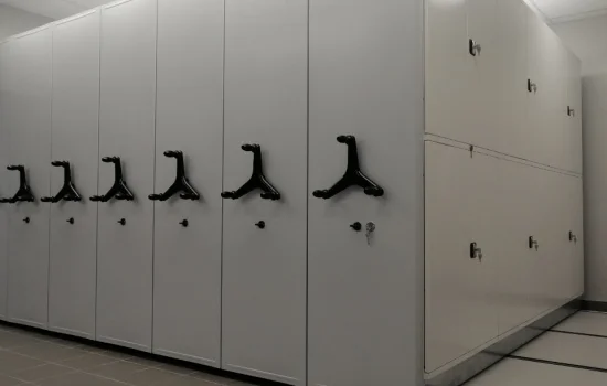 Закрывающиеся мобильные стеллажи с шестью дверцами на каждой секции. Высота закрытого стеллажа 3300 мм.