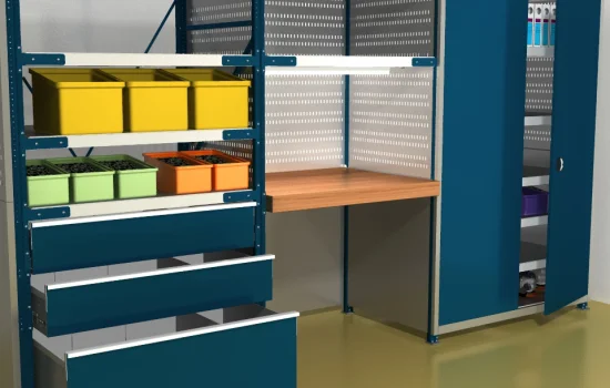 Стеллажные комплексы с ящиками, дверями и рабочим местом — это идеальное решение для организации хранения и работы с мелкими предметами на складе, в цехе. Они представляют собой эргономичную систему хранения, которая обеспечивает быстрый и удобный доступ к необходимым инструментам или деталям.