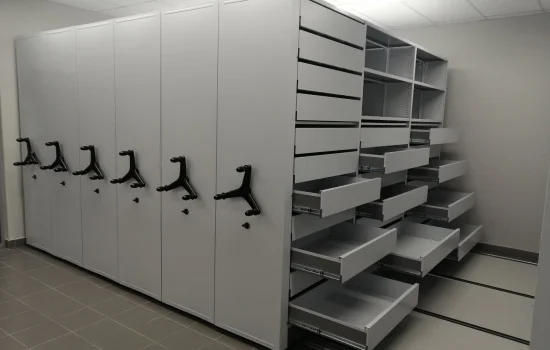 Мобильные стеллажи с электроприводом серии «Актив» оборудованы ящиками для хранения папок с кальками и чертежами. Автоматизированная система управления помогает легко находить документы.